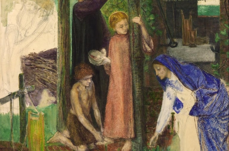 Nesta aquarela de Dante Gabriel Rossetti, somos apresentados a uma cena rica em simbolismo e emoção envolvendo a família de Cristo durante a Páscoa. À medida que observamos da esquerda para a direita, encontramos Zacarias, um jovem João Batista, o menino Jesus e a Virgem Maria. A obra não está completamente finalizada, e algumas áreas, como as figuras de José e Isabel, permanecem apenas sugeridas como esboços no canto superior esquerdo. Na concepção sugerida, veríamos José segurando o cordeiro pascal enquanto Isabel acende uma fogueira.