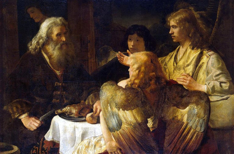 Na arte do Oriente, o exemplo mais famoso dessa interpretação trinitária é o ícone da Trindade de Andrei Rublev [Leia mais sobre este ícone]. Na arte do Ocidente, uma de suas melhores expressões é encontrada nesta pintura holandesa da Idade de Ouro da década de 1630 de Jan Victors. A obra retrata Abraão sentado à mesa com seus três convidados. Ansioso para mostrar hospitalidade aos visitantes, ele providenciou às pressas uma refeição de bolos recém-assados e carne macia. Victors retrata a mais alta das três figuras angelicais falando diretamente com Abraão, que faz uma pausa para ouvir. Abraham parece intrigado e levanta os olhos de sua comida para fazer contato visual direto. O que lhe é dito é nada menos que surpreendente: sua esposa Sarah - que já passou da idade de ter filhos - logo dará à luz um filho. Todos os rostos angelicais estão voltados para Abraão, como se a figura alta falasse não apenas por si mesmo, mas em nome dos três como um todo unificado.