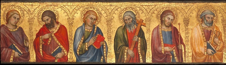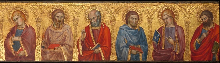 Esta pintura, de Taddeo di Bartolo, mostrando Cristo [ao centro] e seus doze apóstolos sob uma arcada trabalhada no fundo dourado é da base (predela) de um retábulo não identificado. Embora nem todos os apóstolos possam ser identificados com certeza, alguns são pintados carregando seus símbolos iconográficos tradicionais, permitindo ligá-los a um apóstolo específico.