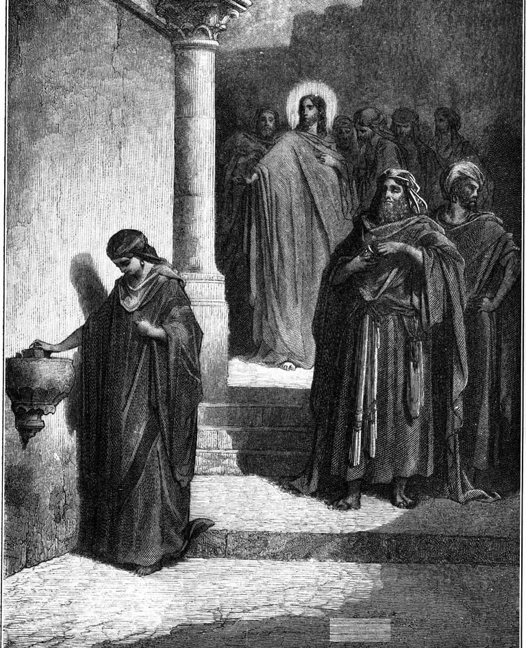 O óbolo da viúva —41 E, sentado frente ao Tesouro do Templo, observava, como a multidão lançava pequenas moedas no Tesouro, e muitos ricos lançavam muitas moedas. 42 Vindo uma pobre viúva, lançou duas moedinhas, isto é, um quadrante. 43 E chamando a si os discípulos, disse-lhes: “Em verdade eu vos digo que esta viúva que é pobre lançou mais do que todos os que ofereceram moedas ao Tesouro. 44 Pois todos os outros deram do que lhes sobrava. Ela, porém, na sua penúria, ofereceu tudo o que tinha, tudo o que possuía para viver”.