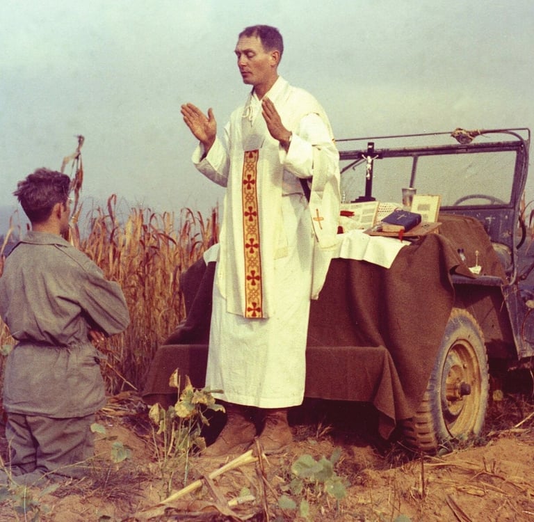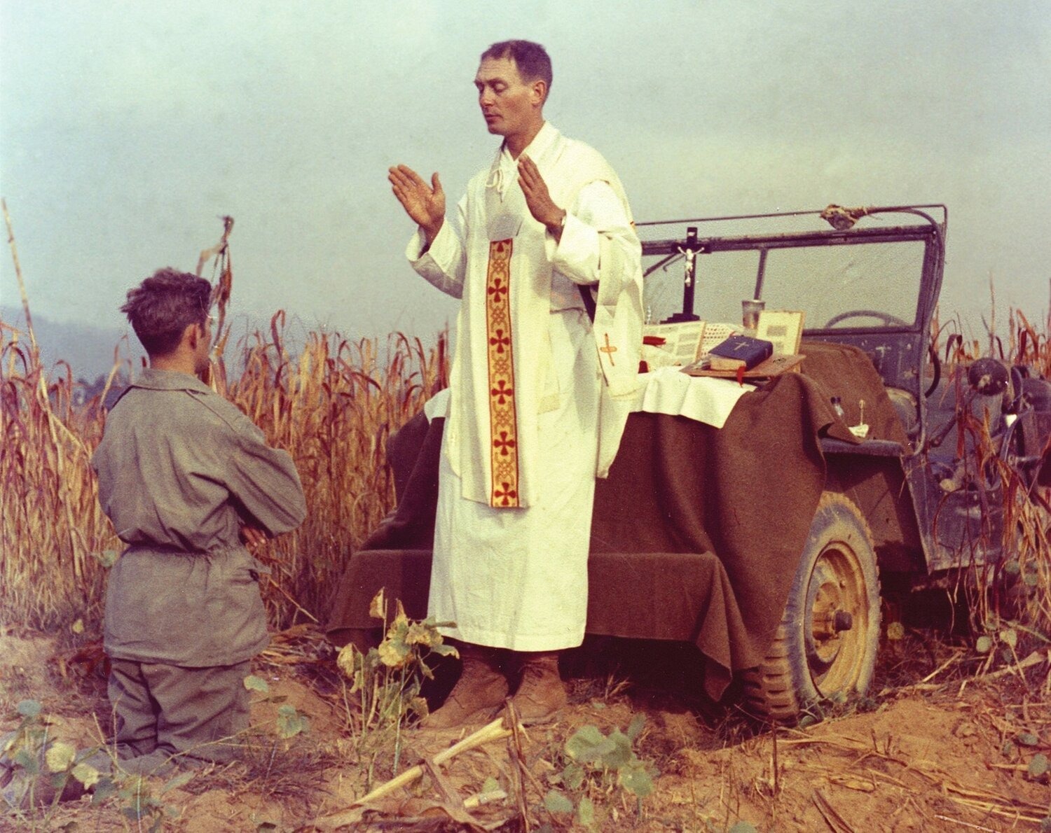 Emil Joseph Kapaun tornou-se padre em9 de junho de 1940, após estudar no Seminário Kenrick em St. Louis. Ele se juntou ao Corpo de Capelães Católicos do Exército dos EUA em 1944. Ele foi enviado para a Segunda Guerra Mundial em 1945, e posteriormente, em 1950, foi enviado para a Coreia do Sul, durante a Guerra da Coreia. Em 1º de novembro de 1950, perto da cidade de Unsan, na Coreia do Norte, Kapaun se movia livremente pelo campo de batalha sob fogo intenso. Ele rastejava pelos valas, corria por terreno aberto e arrastava soldados feridos para um local seguro. Parava para prestar primeiros socorros, trocar curativos e oferecer orações. Dava as últimas unções aos moribundos em crateras rasas enquanto as balas zuniam acima de sua cabeça. Ele passava por áreas onde ninguém mais se atrevia a ir para procurar sobreviventes. Seus companheiros de pelotão relataram que “ele sempre parecia calmo e concentrado”. De onde viria está calma?