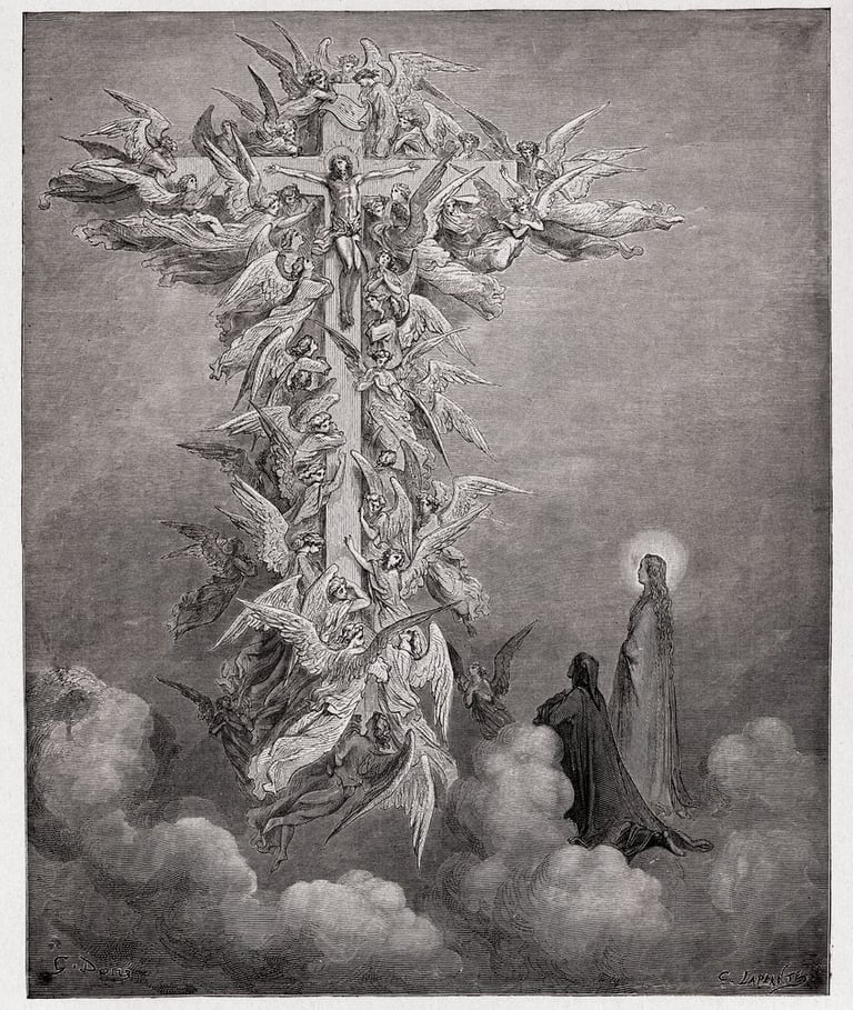 Dante e Beatrice veem Cristo com os anjos na cruz - Ilustração de Gustave Dore (1832-1883).