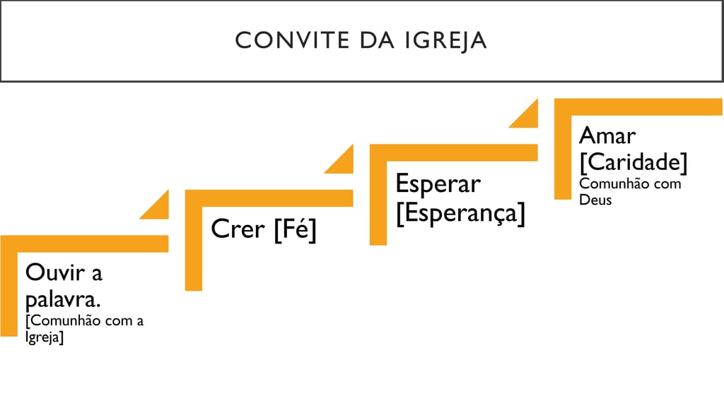 Em Suma, A Igreja nos convida à comunhão para que o fiel cresça nas virtudes teologais (fé, esperança e caridade), para que possamos entrar em comunhão com Deus (figura abaixo). Para tal nos estabelece a genuína doutrina da revelação divina e como se deve dá a sua transmissão.