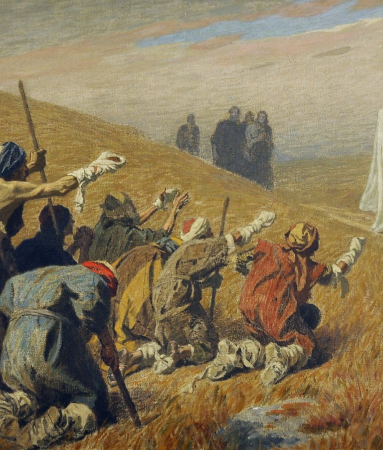 Os dez leprosos —11 Como ele se encaminhasse para Jerusalém, passava através da Samaria e da Galiléia. 12 Ao entrar num povoado, dez leprosos vieram-lhe ao encontro. Pararam à distância 13 e clamaram: “Jesus, Mestre, tem compaixão de nós!” 14 Vendo-os, ele lhes disse: ‘Ide mostrar-vos aos sacerdotes”. E aconteceu que, enquanto iam, ficaram purificados. 15 Um dentre eles, vendo-se curado, voltou atrás, glorificando a Deus em alta voz, 16 e lançou-se aos pés de Jesus com o rosto por terra, agradecendo-lhe. Pois bem, era um samaritano. “Tomando a palavra, Jesus lhe disse: “Os dez não ficaram purificados? Onde estão os outros nove? 18 Não houve, acaso, quem voltasse para dar glória a Deus senão este estrangeiro?” 19 Em seguida, disse-lhe: “Levanta-te e vai; a tua fé te salvou”.