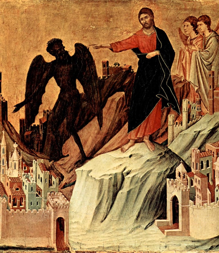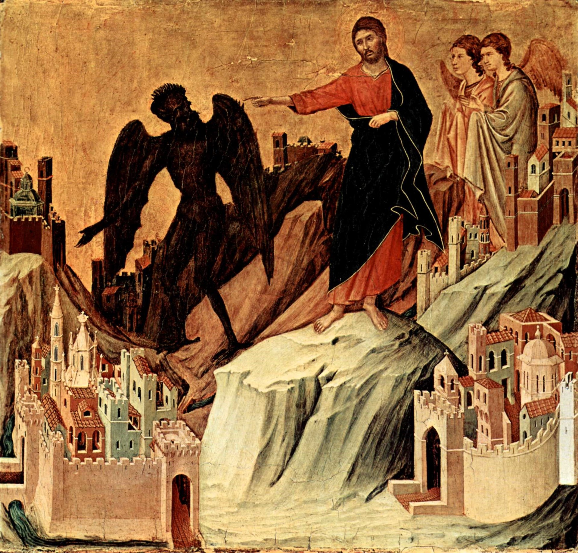 Maestà, retábulo da Catedral de Siena, verso, predela com cenas da tentação de Cristo e milagres, cena: tentação de Cristo na montanha